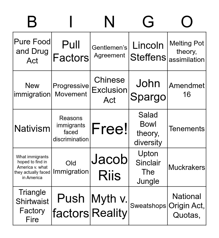 This bingo card has a free space and 24 words: Old Immigration, Push factors, Chinese Exclusion Act, Triangle Shirtwaist Factory Fire, Melting Pot theory, assimilation, Pure Food and Drug Act, New immigration, Pull Factors, Salad Bowl theory, diversity, Jacob Riis, John Spargo, Nativism, Upton Sinclair The Jungle, Muckrakers, Progressive Movement, Sweatshops, Tenements, Gentlemen’s Agreement, Amendmet 16, Reasons immigrants faced discrimination, National Origin Act, Quotas,, What immigrants hoped to find in America v. what they actually faced in America, Lincoln Steffens and Myth v. Reality.