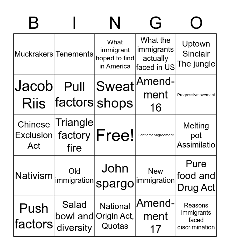 This bingo card has a free space and 24 words: Old immigration, Salad bowl and diversity, Sweat shops, Push factors, Uptown Sinclair The jungle, Muckrakers, Jacob Riis, Tenements, Gentlemenagreement, John spargo, Amend-ment 16, Chinese Exclusion Act, New immigration, Pure food and Drug Act, Pull factors, Amend-ment 17, Melting pot Assimilatio, What immigrant hoped to find in America, Progressivmovement, Triangle factory fire, Reasons immigrants faced discrimination, Nativism, What the immigrants actually faced in US and National Origin Act, Quotas.