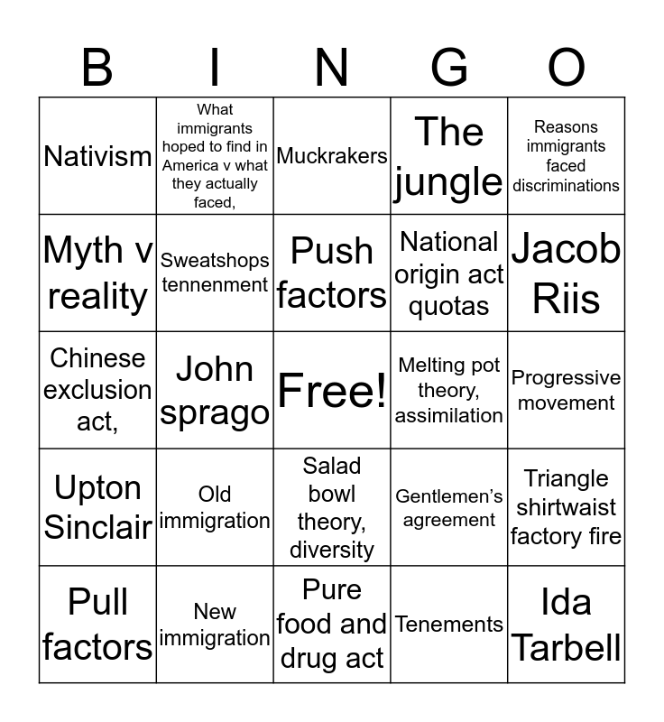 This bingo card has a free space and 24 words: Old immigration, New immigration, Push factors, Pull factors, Reasons immigrants faced discriminations, Nativism, Myth v reality, What immigrants hoped to find in America v what they actually faced,, Melting pot theory, assimilation, Salad bowl theory, diversity, National origin act quotas, Chinese exclusion act,, Gentlemen’s agreement, Triangle shirtwaist factory fire, Sweatshops tennenment, Tenements, Progressive movement, Muckrakers, Jacob Riis, John sprago, Ida Tarbell, Upton Sinclair, The jungle and Pure food and drug act.