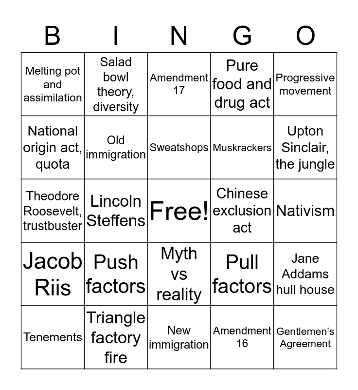 This bingo card has a free space and 24 words: Push factors, Triangle factory fire, Sweatshops, Tenements, Progressive movement, Melting pot and assimilation, National origin act, quota, Salad bowl theory, diversity, Chinese exclusion act, Myth vs reality, Muskrackers, Theodore Roosevelt, trustbuster, Pull factors, Jane Addams hull house, Old immigration, Amendment 16, Nativism, Amendment 17, Upton Sinclair, the jungle, Lincoln Steffens, Gentlemen’s Agreement, Jacob Riis, Pure food and drug act and New immigration.