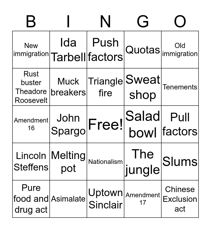 This bingo card has a free space and 24 words: Melting pot, Asimalate, Triangle fire, Pure food and drug act, Old immigration, New immigration, Rust buster Theadore Roosevelt, Ida Tarbell, Salad bowl, Nationalism, Sweat shop, Amendment 16, The jungle, Slums, Muck breakers, Amendment 17, Pull factors, Push factors, Tenements, John Spargo, Chinese Exclusion act, Lincoln Steffens, Quotas and Uptown Sinclair.