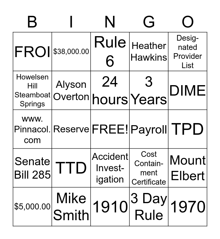 This bingo card has a free space and 24 words: TTD, Mike Smith, 24 hours, $5,000.00, Desig- nated Provider List, FROI, Howelsen Hill Steamboat Springs, $38,000.00, Payroll, Accident Invest-igation, 3 Years, www. Pinnacol. com, Cost Contain- ment Certificate, Mount Elbert, Alyson Overton, 3 Day Rule, TPD, Rule 6, DIME, Reserve, 1970, Senate Bill 285, Heather Hawkins and 1910.