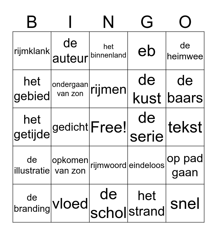 This bingo card has a free space and 28 words: op pad gaan, vertrekken, de kust, het strand, het gebied, het binnenland, de auteur, de illustratie, de serie, de branding, het getijde, eb, vloed, de schol, de baars, de tong, opkomen van zon, ondergaan van zon, rijmen, rijmwoord, rijmklank, geleidelijk, snel, gedicht, tekst, eindeloos, de heimwee and muziekaal.