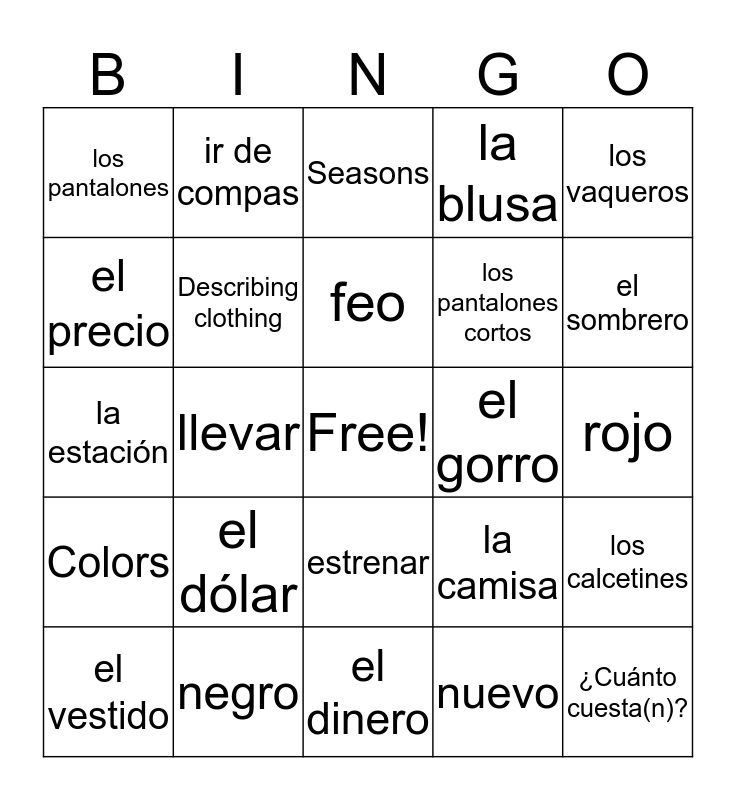 This bingo card has a free space and 47 words: el centro comercial, ¿Cuánto cuesta(n)?, Cuesta(n)….., el dinero, el dólar, el euro, ir de compas, pagar, el precio, la tienda, Describing clothing, la blusa, los calcetines, la camisa, la camisetta, la chaqueta, feo, el gorro, la gorra, los vaqueros, llevar, nuevo, los pantalones, los pantalones cortos, la ropa, el sombrero, el vestido, los zapatos, estrenar, Colors, amarillo, anaranjado, azul, blanco, marrón/café, negro, rojo, verde, morado, rosa, gris, Seasons, la estación, el invierno, la primavera, el verano and el otoño.