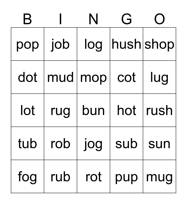 This bingo card has 25 words: rob, rot, mop, fog, shop, pop, dot, job, hot, jog, cot, lot, sub, sun, mud, mug, rush, log, lug, rug, bun, rub, tub, hush and pup.