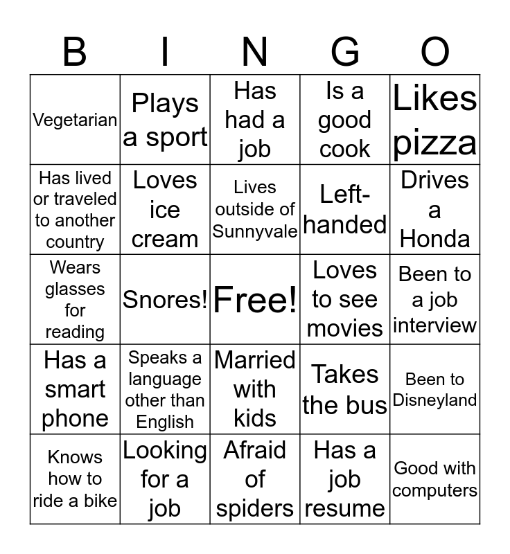 This bingo card has a free space and 24 words: Speaks a language other than English, Looking for a job, Lives outside of Sunnyvale, Knows how to ride a bike, Likes pizza, Vegetarian, Has lived or traveled to another country, Plays a sport, Loves to see movies, Married with kids, Left-handed, Wears glasses for reading, Takes the bus, Been to Disneyland, Loves ice cream, Has a job resume, Been to a job interview, Has had a job, Drives a Honda, Snores!, Good with computers, Has a smart phone, Is a good cook and Afraid of spiders.