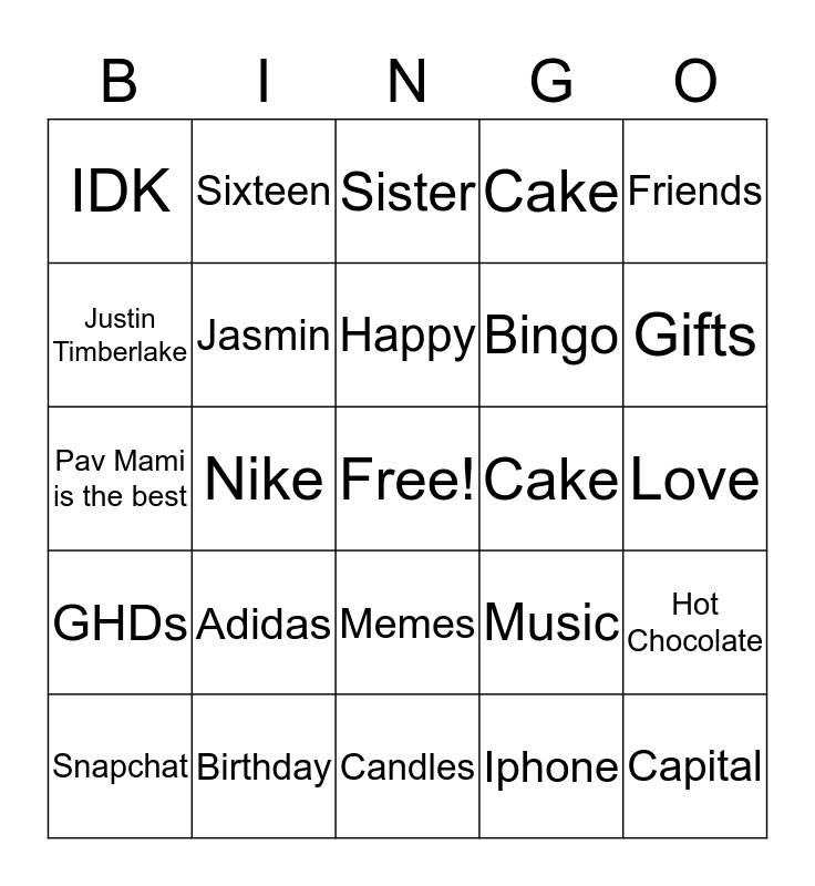 This bingo card has a free space and 24 words: Adidas, Birthday, Happy, Snapchat, Friends, IDK, Justin Timberlake, Sixteen, Cake, Memes, Bingo, Pav Mami is the best, Music, Hot Chocolate, Jasmin, Iphone, Love, Sister, Gifts, Nike, Capital, GHDs, Cake and Candles.