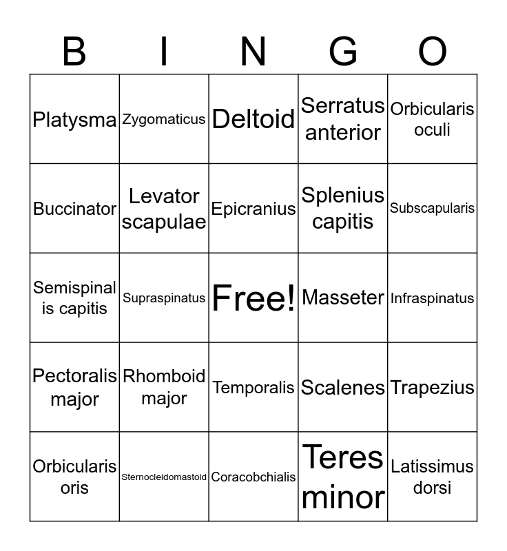 This bingo card has a free space and 24 words: Rhomboid major, Sternocleidomastoid, Epicranius, Orbicularis oris, Orbicularis oculi, Platysma, Buccinator, Zygomaticus, Masseter, Temporalis, Splenius capitis, Semispinal is capitis, Scalenes, Trapezius, Levator scapulae, Teres minor, Infraspinatus, Deltoid, Subscapularis, Supraspinatus, Latissimus dorsi, Pectoralis major, Serratus anterior and Coracobchialis.