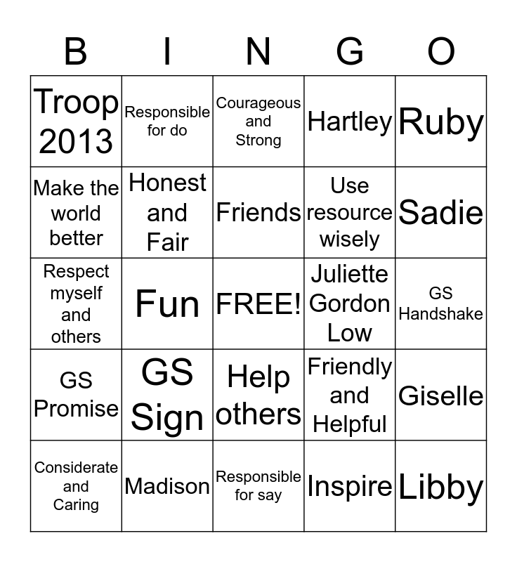 This bingo card has a free space and 36 words: Daisy, Janelle, Girl Scouts, Honest and Fair, Friendly and Helpful, GS Promise, Friends, Quiet Sign, Ruby, Kacey, Fun, Hartley, Kyra, Juliette Gordon Low, Sadie, Troop 2013, Aurora, GS Sign, Libby, Courageous and Strong, GS Handshake, Giselle, Madison, Considerate and Caring, Responsible for say, Responsible for do, Respect myself and others, Respect authority, Use resource wisely, Make the world better, Sister to every GS, Bridging, Inspire, Help others, Traditions and Awards.