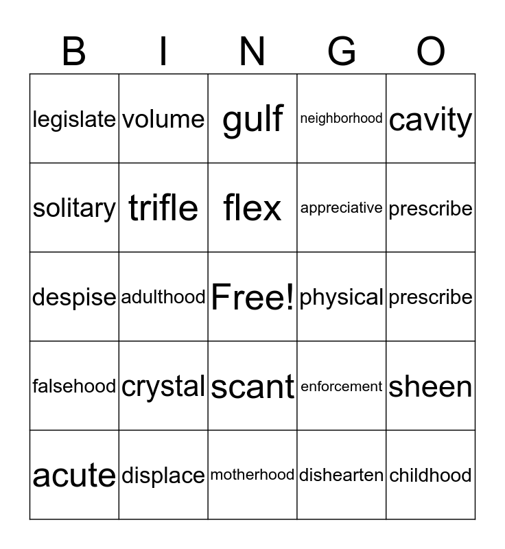 This bingo card has a free space and 24 words: crystal, displace, flex, acute, cavity, legislate, solitary, volume, physical, scant, appreciative, despise, enforcement, sheen, trifle, dishearten, prescribe, gulf, prescribe, adulthood, childhood, falsehood, neighborhood and motherhood.