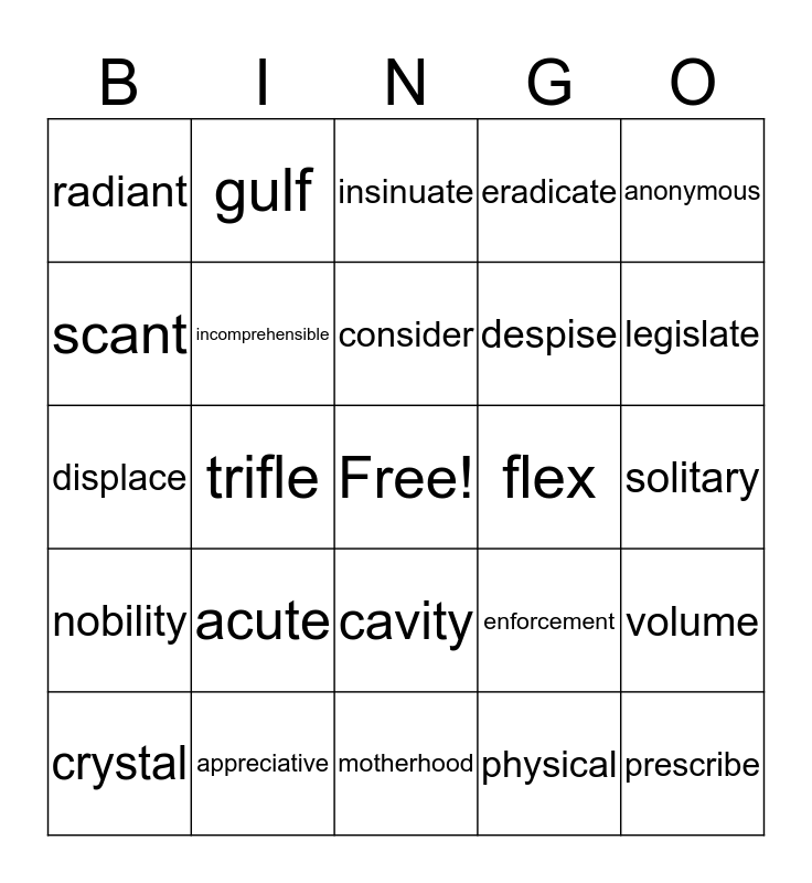 This bingo card has a free space and 24 words: acute, appreciative, consider, crystal, anonymous, radiant, scant, gulf, flex, cavity, despise, displace, enforcement, volume, incomprehensible, physical, solitary, insinuate, legislate, trifle, prescribe, nobility, eradicate and motherhood.