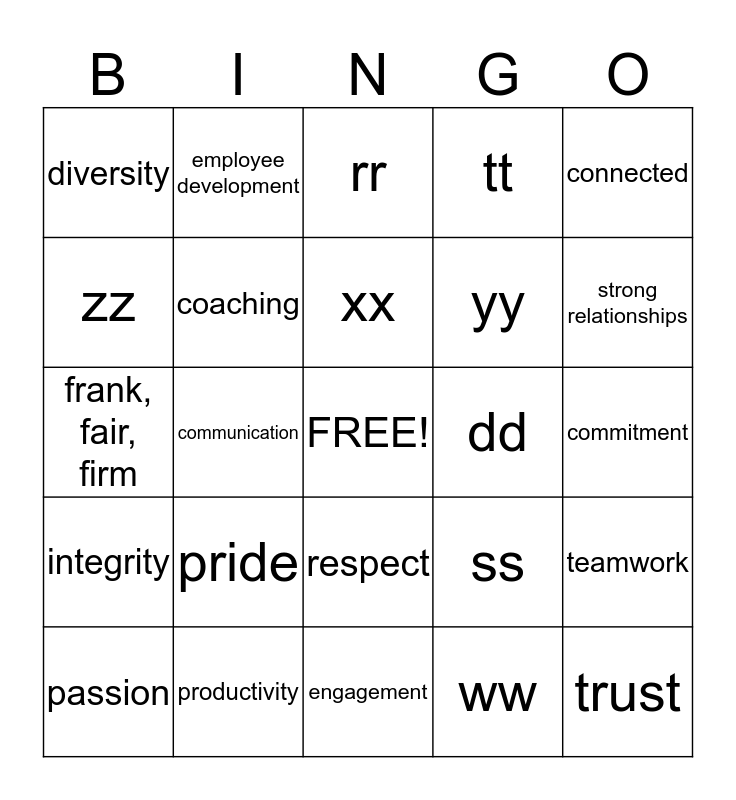 This bingo card has a free space and 24 words: pride, productivity, xx, passion, connected, diversity, zz, employee development, dd, respect, yy, frank, fair, firm, ss, teamwork, coaching, ww, commitment, rr, strong relationships, communication, trust, integrity, tt and engagement.