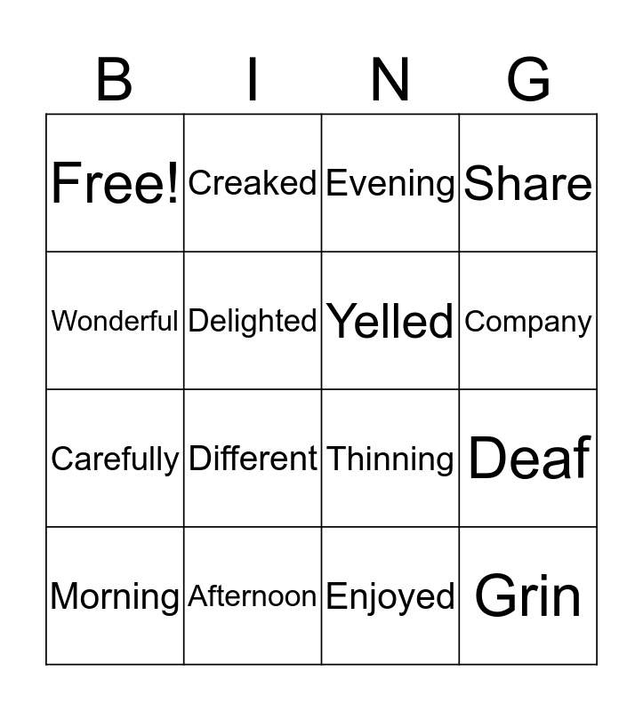 This bingo card has 16 words: Morning, Afternoon, Evening, Share, Wonderful, Creaked, Thinning, Deaf, Free!, Delighted, Enjoyed, Company, Carefully, Different, Yelled and Grin.