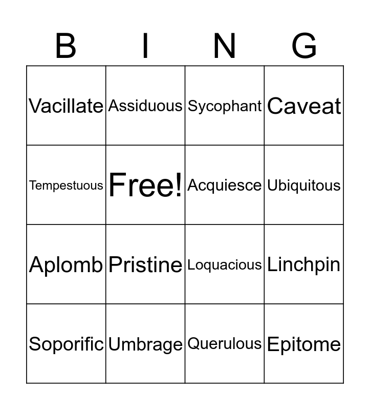 This bingo card has 16 words: Umbrage, Linchpin, Sycophant, Vacillate, Aplomb, Assiduous, Loquacious, Querulous, Tempestuous, Free!, Soporific, Caveat, Pristine, Ubiquitous, Acquiesce and Epitome.