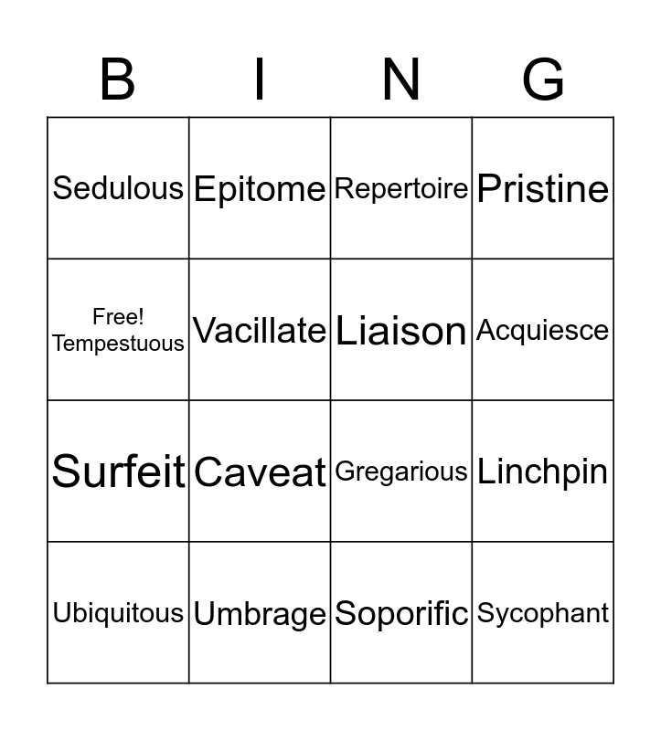 This bingo card has 16 words: Umbrage, Linchpin, Repertoire, Sedulous, Surfeit, Epitome, Gregarious, Soporific, Free! Tempestuous, Vacillate, Ubiquitous, Pristine, Caveat, Acquiesce, Liaison and Sycophant.