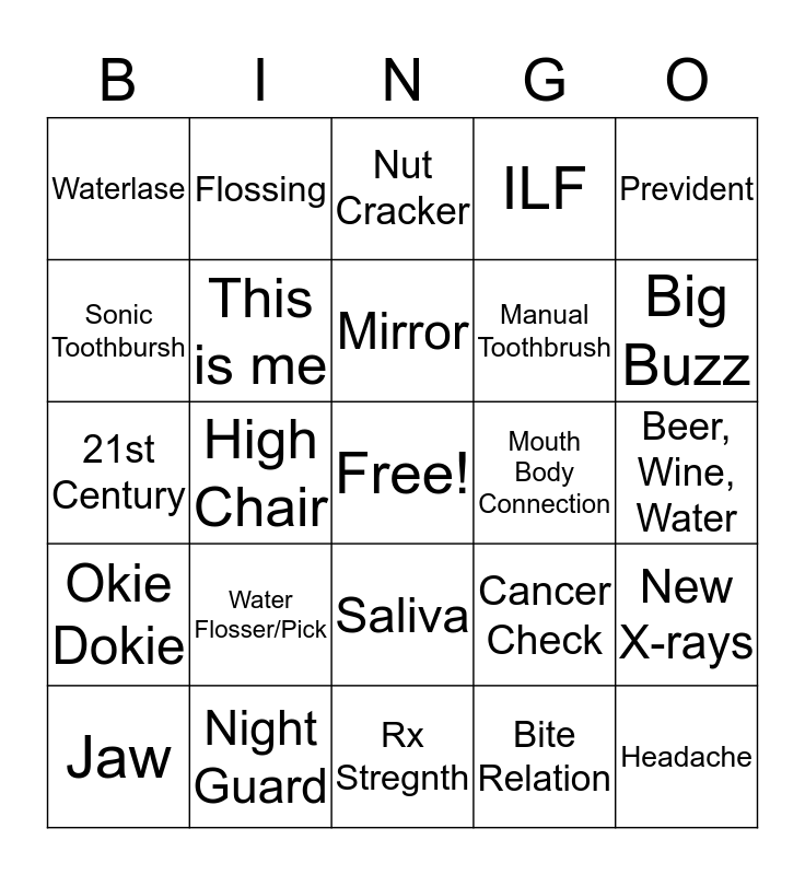 This bingo card has a free space and 24 words: Water Flosser/Pick, Night Guard, Mirror, Jaw, Prevident, Waterlase, Sonic Toothbursh, Flossing, Mouth Body Connection, Saliva, Manual Toothbrush, 21st Century, Cancer Check, New X-rays, This is me, Bite Relation, Beer, Wine, Water, Nut Cracker, Big Buzz, High Chair, Headache, Okie Dokie, ILF and Rx Stregnth.