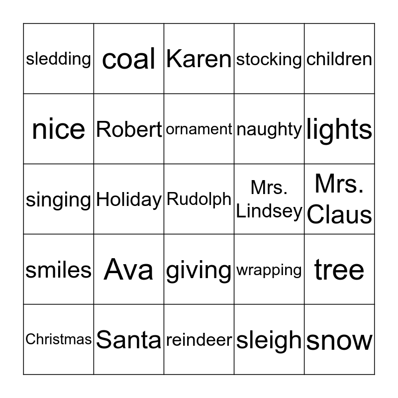 This bingo card has 29 words: Christmas, Merry, Holiday, snow, sledding, Karen, Robert, Ava, Mrs. Lindsey, Santa, Mrs. Claus, Rudolph, reindeer, sleigh, lights, presents, giving, smiles, children, singing, wrapping, shopping, naughty, nice, stocking, coal, tree, ornament and icicles.