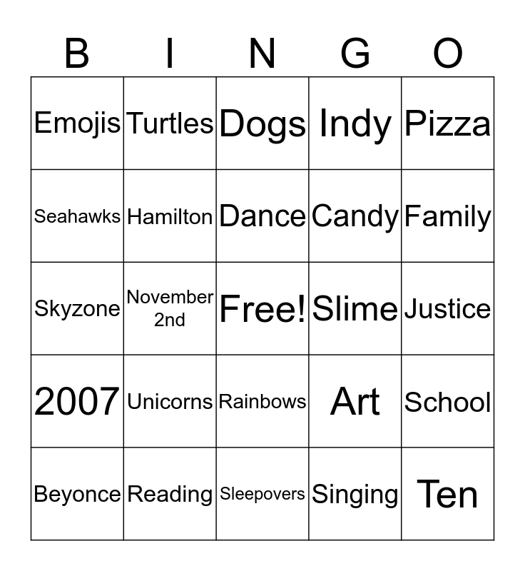 This bingo card has a free space and 24 words: Unicorns, Reading, Dance, Beyonce, Pizza, Emojis, Seahawks, Turtles, Slime, Rainbows, Candy, Skyzone, Art, School, Hamilton, Singing, Justice, Dogs, Family, November 2nd, Ten, 2007, Indy and Sleepovers.