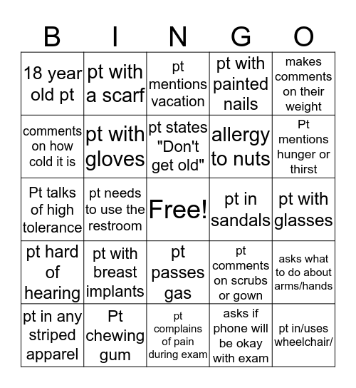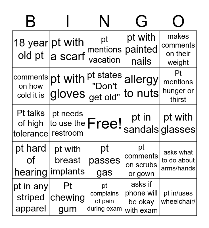 This bingo card has a free space and 24 words: pt with breast implants, Pt chewing gum, pt states "Don't get old", pt in any striped apparel, makes comments on their weight, 18 year old pt, comments on how cold it is, pt with a scarf, pt in sandals, pt passes gas, allergy to nuts, Pt talks of high tolerance, pt comments on scrubs or gown, asks what to do about arms/hands, pt with gloves, asks if phone will be okay with exam, pt with glasses, pt mentions vacation, Pt mentions hunger or thirst, pt needs to use the restroom, pt in/uses wheelchair/, pt hard of hearing, pt with painted nails and pt complains of pain during exam.
