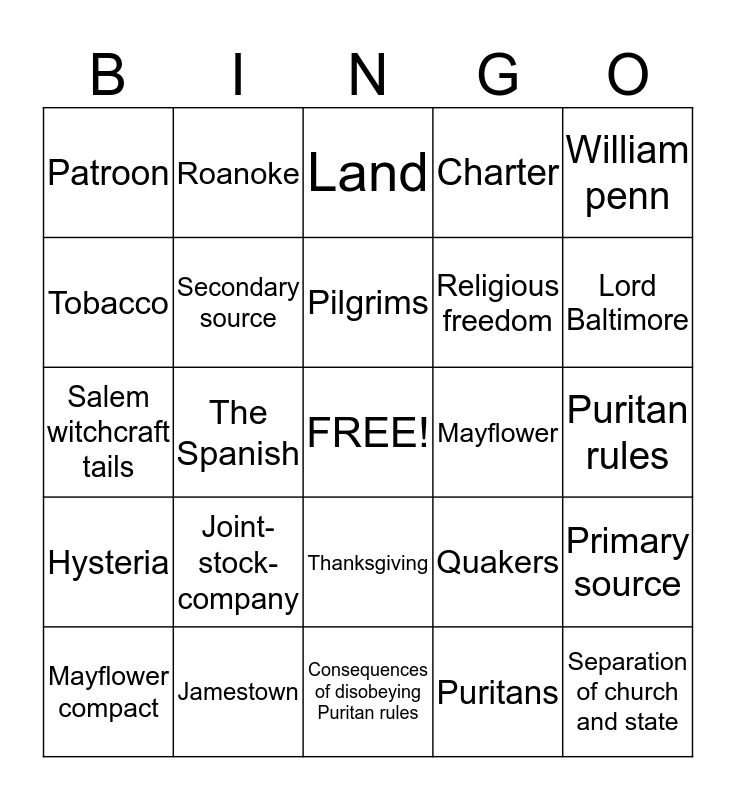 This bingo card has a free space and 24 words: Joint-stock-company, Jamestown, Pilgrims, Mayflower compact, William penn, Patroon, Tobacco, Roanoke, Mayflower, Thanksgiving, Religious freedom, Salem witchcraft tails, Quakers, Primary source, Secondary source, Puritans, Puritan rules, Land, Lord Baltimore, The Spanish, Separation of church and state, Hysteria, Charter and Consequences of disobeying Puritan rules.