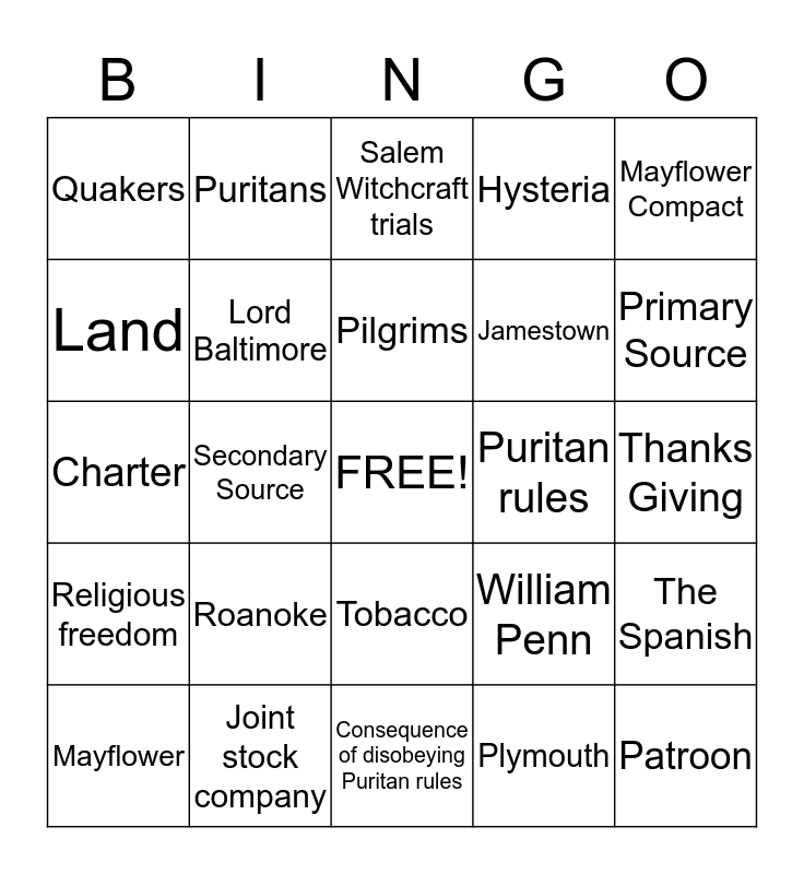 This bingo card has a free space and 24 words: Roanoke, Joint stock company, Pilgrims, Mayflower, Mayflower Compact, Quakers, Land, Puritans, Puritan rules, Tobacco, Jamestown, Charter, William Penn, The Spanish, Lord Baltimore, Plymouth, Thanks Giving, Salem Witchcraft trials, Primary Source, Secondary Source, Patroon, Religious freedom, Hysteria and Consequence of disobeying Puritan rules.
