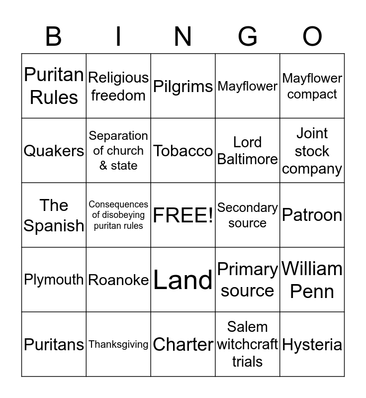This bingo card has a free space and 24 words: Roanoke, Thanksgiving, Tobacco, Puritans, Mayflower compact, Puritan Rules, Quakers, Religious freedom, Secondary source, Land, Lord Baltimore, The Spanish, Primary source, William Penn, Separation of church & state, Salem witchcraft trials, Patroon, Pilgrims, Joint stock company, Consequences of disobeying puritan rules, Hysteria, Plymouth, Mayflower and Charter.
