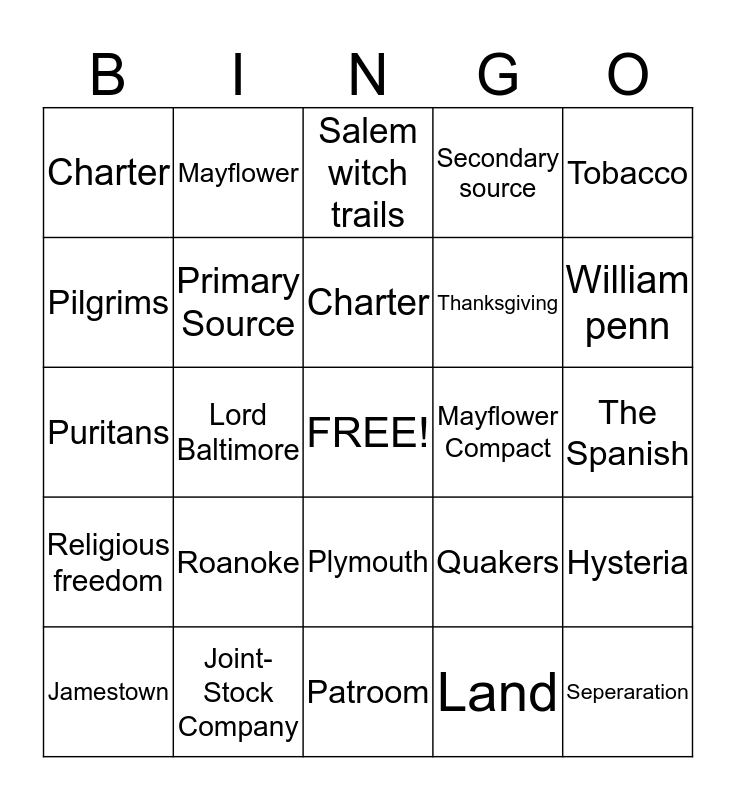 This bingo card has a free space and 24 words: Roanoke, Joint-Stock Company, Charter, Jamestown, Tobacco, Charter, Pilgrims, Mayflower, Mayflower Compact, Plymouth, Thanksgiving, Puritans, Quakers, Hysteria, Primary Source, Land, The Spanish, Salem witch trails, William penn, Lord Baltimore, Seperaration, Religious freedom, Secondary source and Patroom.