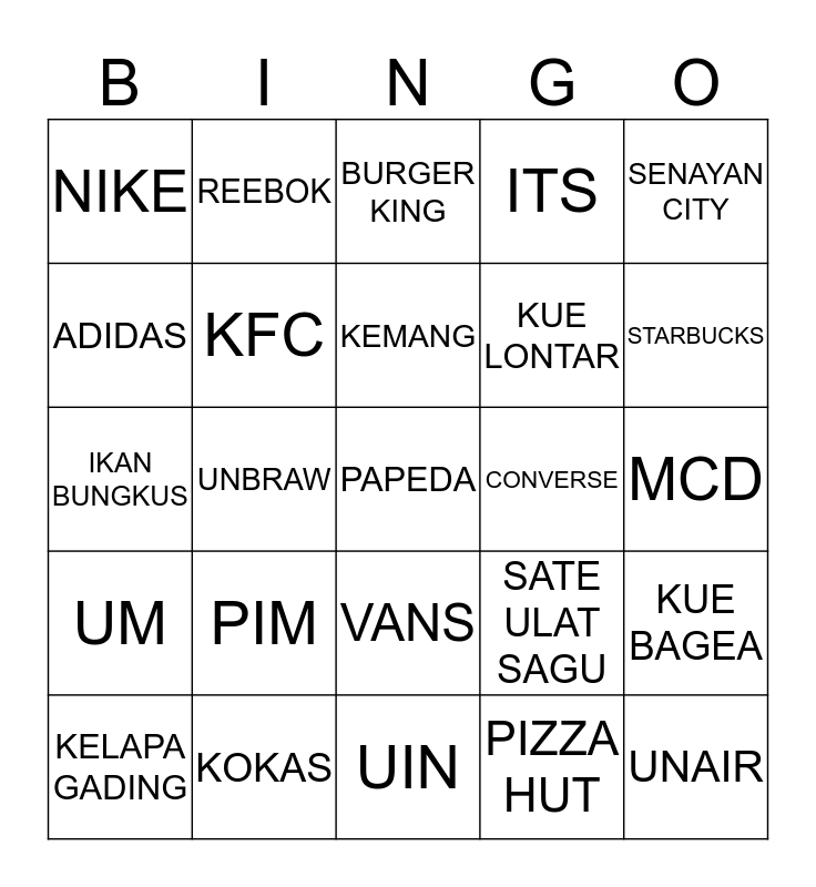 This bingo card has a free space and 24 words: PIM, KOKAS, KEMANG, KELAPA GADING, SENAYAN CITY, NIKE, ADIDAS, REEBOK, CONVERSE, VANS, KUE LONTAR, IKAN BUNGKUS, SATE ULAT SAGU, KUE BAGEA, KFC, PIZZA HUT, MCD, BURGER KING, STARBUCKS, UNBRAW, UNAIR, UM, ITS and UIN.