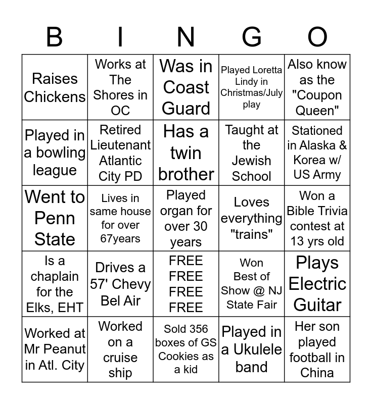This bingo card has a free space and 24 words: Drives a 57' Chevy Bel Air, Worked on a cruise ship, Has a twin brother, Worked at Mr Peanut in Atl. City, Also know as the "Coupon Queen", Raises Chickens, Played in a bowling league, Works at The Shores in OC, Loves everything "trains", FREE FREE FREE FREE, Taught at the Jewish School, Went to Penn State, Won Best of Show @ NJ State Fair, Plays Electric Guitar, Retired Lieutenant Atlantic City PD, Played in a Ukulele band, Won a Bible Trivia contest at 13 yrs old, Was in Coast Guard, Stationed in Alaska & Korea w/ US Army, Lives in same house for over 67years, Her son played football in China, Is a chaplain for the Elks, EHT, Played Loretta Lindy in Christmas/July play and Sold 356 boxes of GS Cookies as a kid.