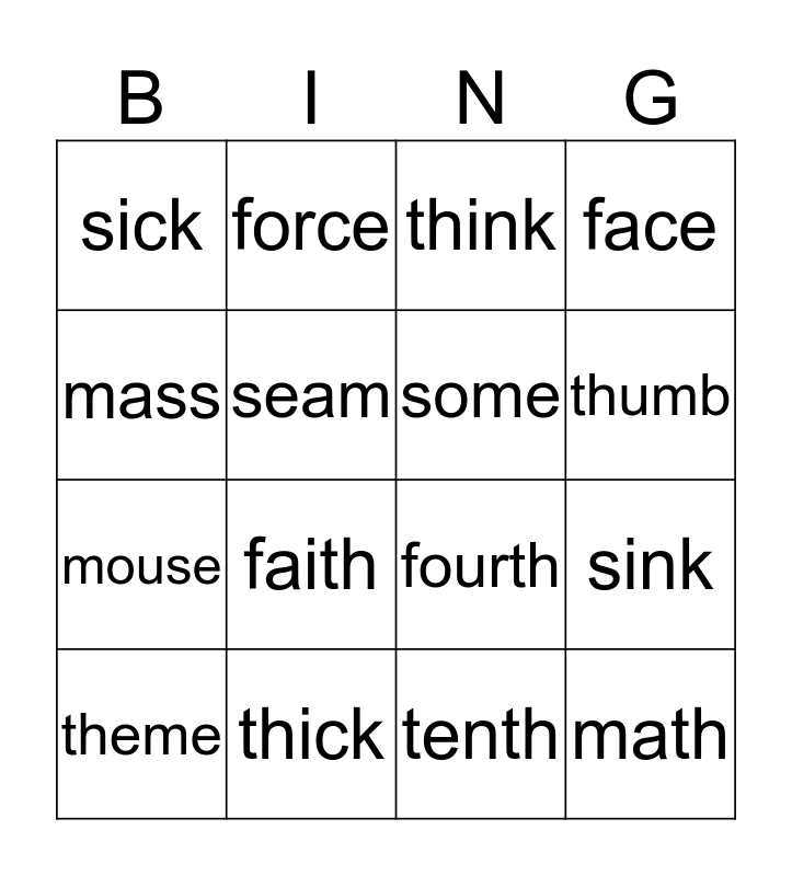 This bingo card has 16 words: thick, sink, think, sick, mouse, force, fourth, tenth, mass, seam, theme, face, faith, thumb, some and math.