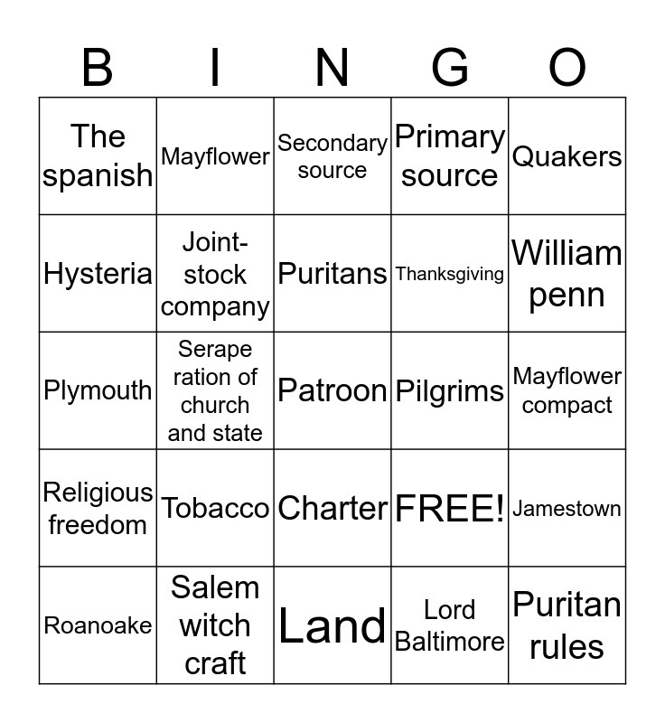 This bingo card has 25 words: Tobacco, Land, Puritans, Roanoake, Quakers, The spanish, Hysteria, Mayflower, Pilgrims, Charter, Thanksgiving, Plymouth, FREE!, Jamestown, Joint-stock company, Puritan rules, Mayflower compact, Secondary source, William penn, Serape ration of church and state, Patroon, Salem witch craft, Religious freedom, Primary source and Lord Baltimore.