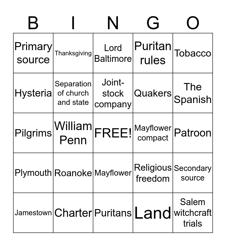 This bingo card has a free space and 24 words: Roanoke, Charter, Joint-stock company, Jamestown, Tobacco, Primary source, Hysteria, Thanksgiving, Mayflower compact, Mayflower, Quakers, Pilgrims, Religious freedom, Secondary source, Separation of church and state, Land, Patroon, Lord Baltimore, The Spanish, William Penn, Salem witchcraft trials, Plymouth, Puritan rules and Puritans.