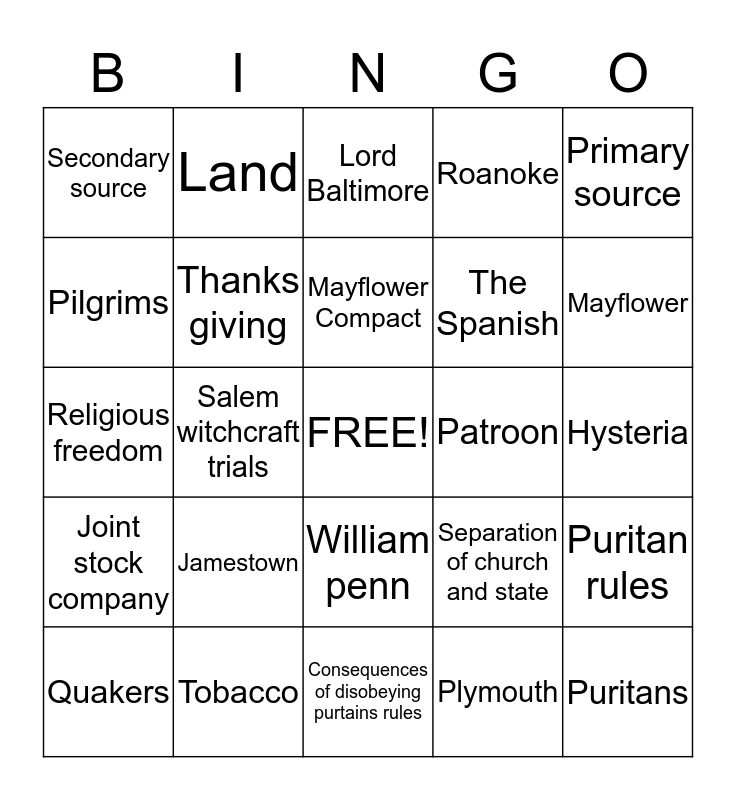 This bingo card has a free space and 24 words: Jamestown, Tobacco, Mayflower Compact, Quakers, Primary source, Secondary source, Pilgrims, Land, Patroon, William penn, The Spanish, Religious freedom, Separation of church and state, Puritan rules, Thanks giving, Plymouth, Hysteria, Lord Baltimore, Mayflower, Salem witchcraft trials, Puritans, Joint stock company, Roanoke and Consequences of disobeying purtains rules.