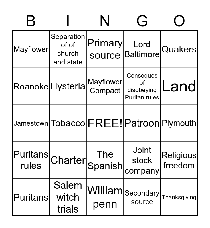 This bingo card has a free space and 24 words: Charter, Salem witch trials, Mayflower Compact, Puritans, Quakers, Mayflower, Roanoke, Separation of of church and state, Patroon, The Spanish, Conseques of disobeying Puritan rules, Jamestown, Joint stock company, Religious freedom, Hysteria, Secondary source, Plymouth, Primary source, Land, Tobacco, Thanksgiving, Puritans rules, Lord Baltimore and William penn.