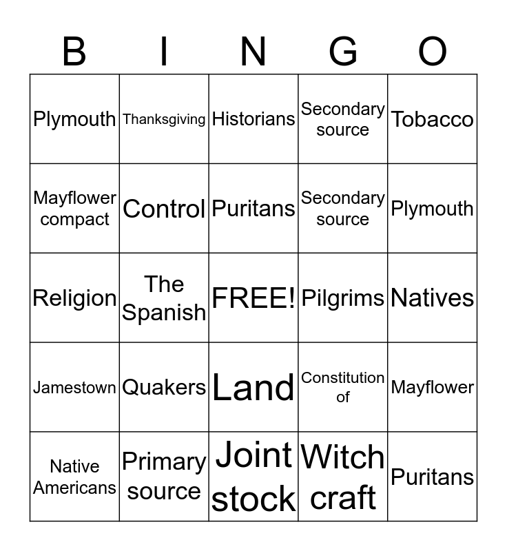 This bingo card has a free space and 24 words: Quakers, Primary source, Puritans, Native Americans, Tobacco, Plymouth, Mayflower compact, Thanksgiving, Pilgrims, Land, Secondary source, Religion, Constitution of, Mayflower, Control, Witch craft, Natives, Historians, Plymouth, The Spanish, Puritans, Jamestown, Secondary source and Joint stock.