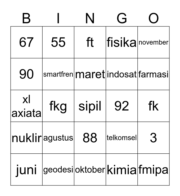 This bingo card has 25 words: agustus, oktober, maret, juni, november, 67, 90, 55, 92, 88, indosat, xl axiata, telkomsel, 3, smartfren, fmipa, fk, ft, farmasi, fkg, sipil, geodesi, nuklir, fisika and kimia.