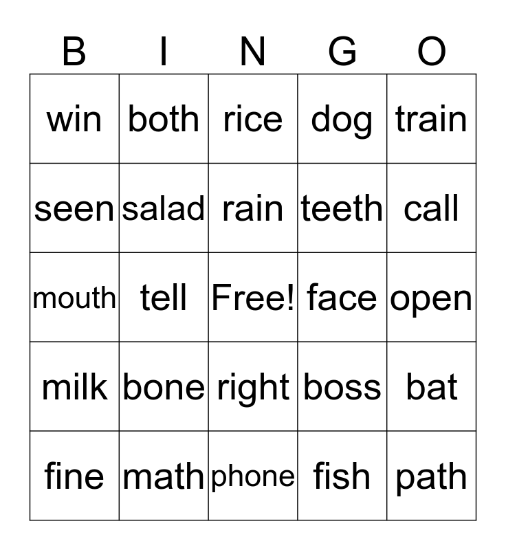 This bingo card has a free space and 24 words: bone, math, rain, fine, train, win, seen, both, face, right, teeth, mouth, boss, bat, salad, fish, open, rice, call, tell, path, milk, dog and phone.
