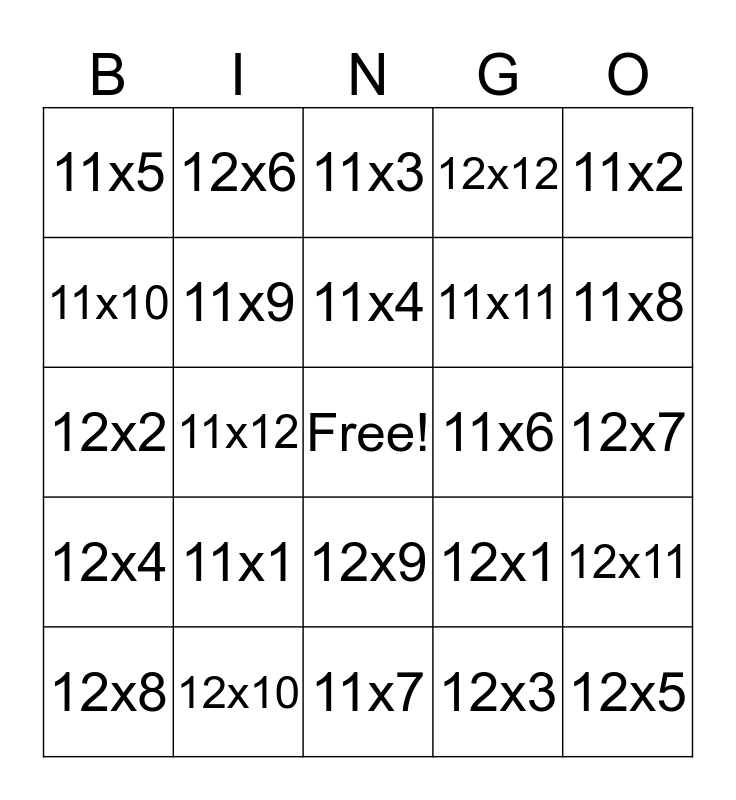 This bingo card has a free space and 24 words: 12x8, 11x1, 11x4, 12x3, 11x2, 11x5, 12x6, 11x3, 11x6, 12x7, 12x2, 11x9, 12x1, 12x11, 11x10, 12x10, 11x7, 12x12, 11x8, 12x4, 11x12, 12x9, 11x11 and 12x5.