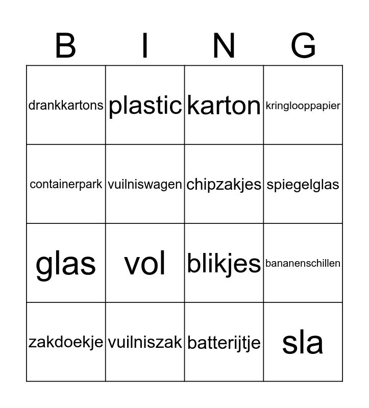 This bingo card has 16 words: vuilniszak, bananenschillen, karton, drankkartons, glas, plastic, blikjes, batterijtje, containerpark, vuilniswagen, zakdoekje, kringlooppapier, vol, spiegelglas, chipzakjes and sla.