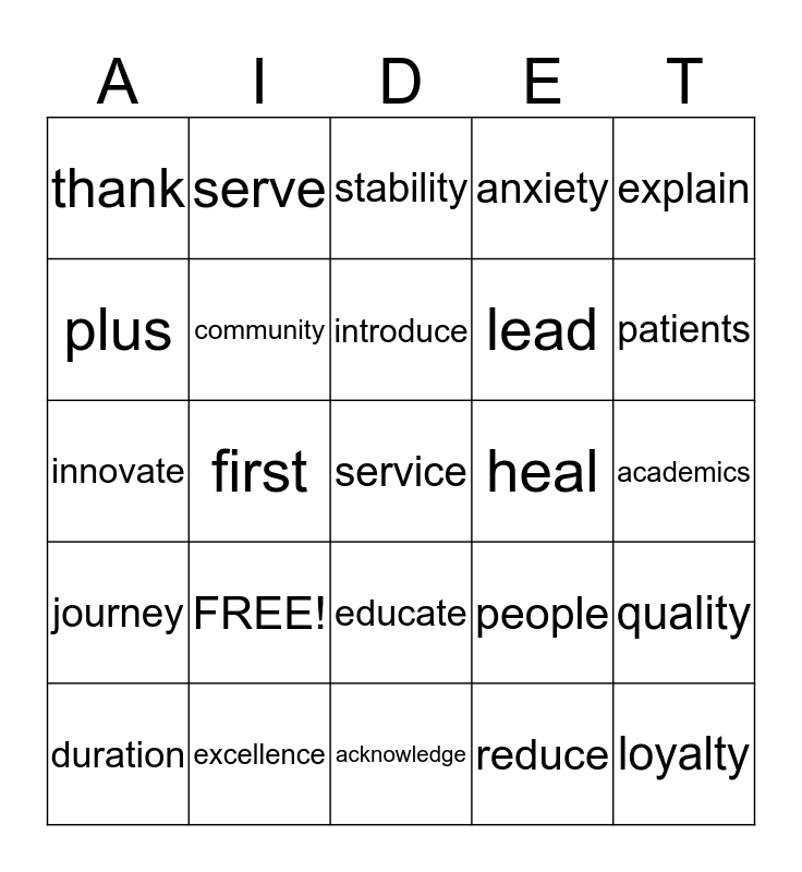 This bingo card has 25 words: FREE!, acknowledge, introduce, duration, explain, thank, plus, serve, heal, educate, lead, innovate, people, quality, community, loyalty, academics, stability, patients, first, service, excellence, journey, anxiety and reduce.