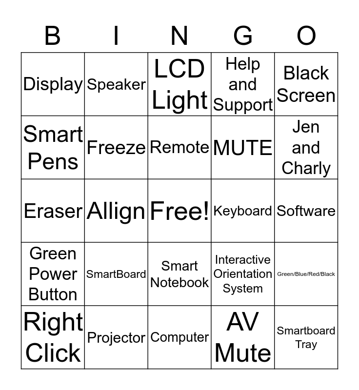 This bingo card has a free space and 24 words: SmartBoard, Projector, Remote, Right Click, Black Screen, Display, Smart Pens, Speaker, Keyboard, Smart Notebook, MUTE, Eraser, Interactive Orientation System, Green/Blue/Red/Black, Freeze, AV Mute, Software, LCD Light, Jen and Charly, Allign, Smartboard Tray, Green Power Button, Help and Support and Computer.