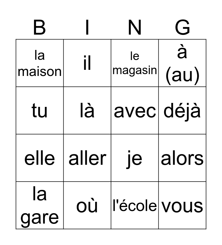 This bingo card has 17 words: l'école, la gare, le magasin, la maison, aller, à (au), alors, avec, déjà, là, où, je, tu, il, elle, nous and vous.