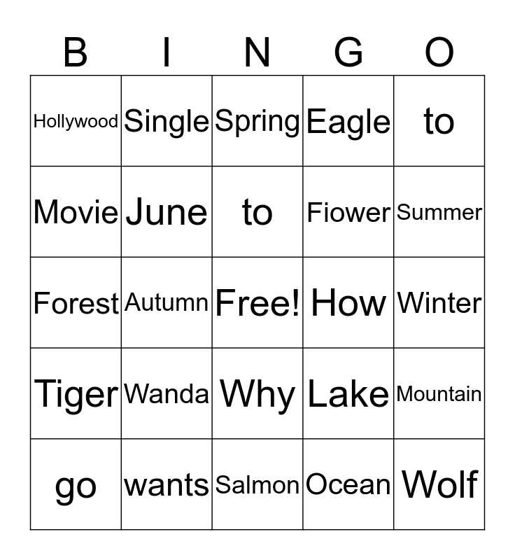 This bingo card has a free space and 24 words: Wanda, wants, to, go, to, Hollywood, Movie, Single, How, Why, Fiower, Forest, Lake, Mountain, June, Ocean, Winter, Spring, Summer, Autumn, Wolf, Tiger, Eagle and Salmon.