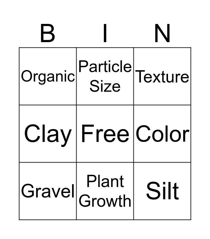 This bingo card has a free space and 8 words: Clay, Particle Size, Color, Gravel, Texture, Organic, Plant Growth and Silt.