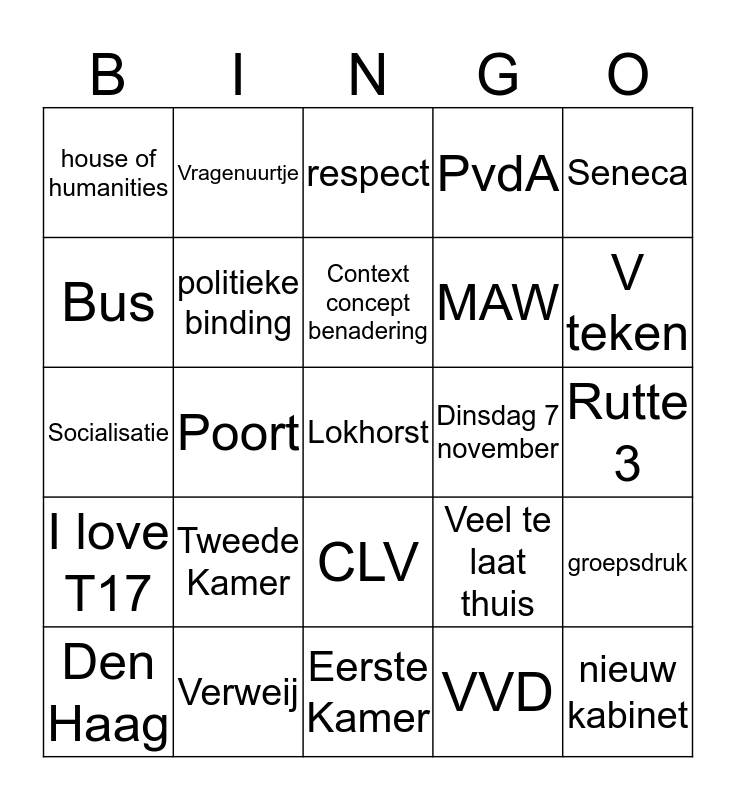 This bingo card has 25 words: Tweede Kamer, Eerste Kamer, Context concept benadering, Den Haag, Seneca, house of humanities, Bus, Vragenuurtje, Dinsdag 7 november, CLV, MAW, Socialisatie, Veel te laat thuis, groepsdruk, politieke binding, nieuw kabinet, Rutte 3, respect, V teken, Poort, Lokhorst, Verweij, I love T17, PvdA and VVD.