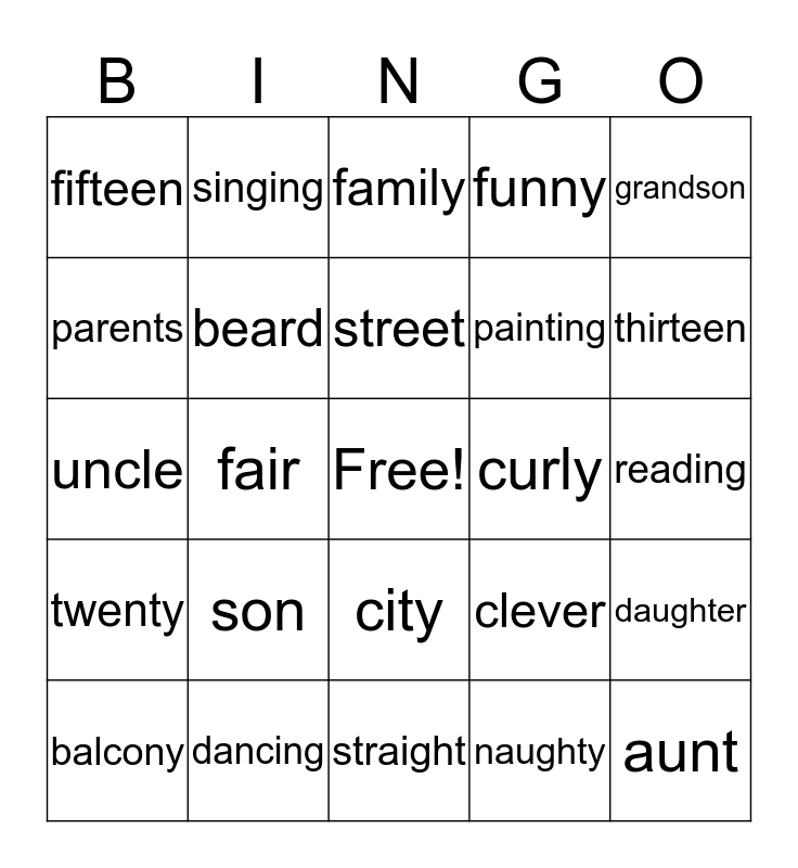 This bingo card has a free space and 24 words: son, dancing, street, balcony, grandson, fifteen, parents, singing, curly, city, painting, uncle, clever, daughter, beard, naughty, reading, family, thirteen, fair, aunt, twenty, funny and straight.