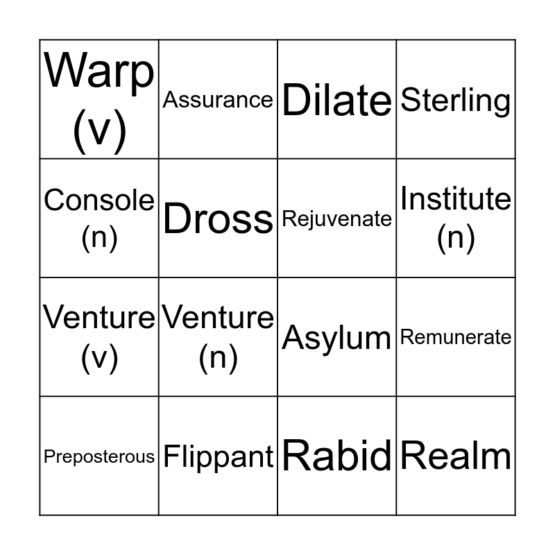 This bingo card has 23 words: Realm, Institute (v), Institute (n), Console (v), Console (n), Warp (v), Dross, Assurance, Preposterous, Liability, Venture (n), Venture (v), Immunity, Dwindle, Flippant, Pugnacious, Dilate, Asylum, Rejuvenate, Remunerate, Sterling, Rabid and Sparse.