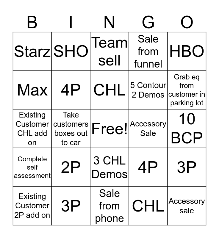 This bingo card has a free space and 24 words: 2P, 3P, CHL, Existing Customer 2P add on, HBO, Starz, Max, SHO, Accessory Sale, 3 CHL Demos, 5 Contour 2 Demos, Existing Customer CHL add on, 4P, 3P, 4P, CHL, 10 BCP, Team sell, Grab eq from customer in parking lot, Take customers boxes out to car, Accessory sale, Complete self assessment, Sale from funnel and Sale from phone.