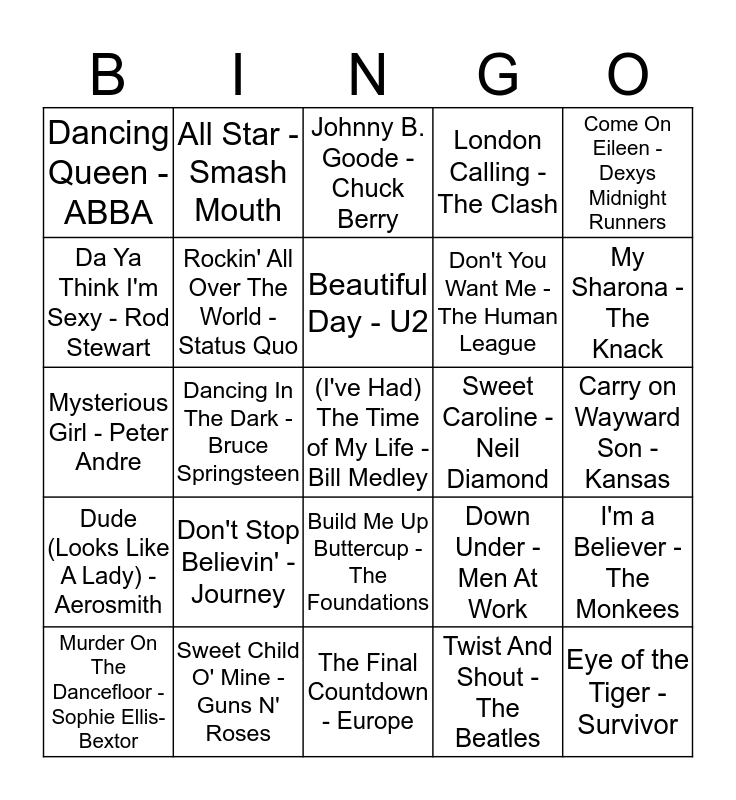 This bingo card has 68 words: (I Can't Get No) Satisfaction - The Rolling Stones, (I've Had) The Time of My Life - Bill Medley, 5, 6, 7, 8 - Steps, 99 Red Balloons - Nena, A Little Respect - Erasure, Ain't No Mountain High Enough - Marvin Gaye, All Star - Smash Mouth, Bad Moon Rising - Creedence Clearwater Revival, Beautiful Day - U2, Black or White - Michael Jackson, Build Me Up Buttercup - The Foundations, Call Me - Blondie, Carry on Wayward Son - Kansas, Come On Eileen - Dexys Midnight Runners, Conga - Miami Sound Machine, Da Ya Think I'm Sexy - Rod Stewart, Dancing In The Dark - Bruce Springsteen, Dancing Queen - ABBA, Don't Go Breaking My Heart - Elton John, Don't Stop Believin' - Journey, Don't You Want Me - The Human League, Down Under - Men At Work, Dude (Looks Like A Lady) - Aerosmith, Eye of the Tiger - Survivor, Footloose - Kenny Loggins, Get It On - T. Rex, Hound Dog - Elvis Presley, I Got You Babe - Sonny & Cher, I'm a Believer - The Monkees, I'm Coming Out - Diana Ross, Johnny B. Goode - Chuck Berry, Jolene - Dolly Parton, Kiss - Prince, Let's Dance - David Bowie, London Calling - The Clash, Love Shack - The B-52's, Mr. Blue Sky - Electric Light Orchestra, Murder On The Dancefloor - Sophie Ellis-Bextor, My Sharona - The Knack, Mysterious Girl - Peter Andre, Oh, Pretty Woman - Roy Orbison, Rock the Boat - Hues Corporation, Rockin' All Over The World - Status Quo, Roxanne - The Police, September - Earth, Wind & Fire, Seven Nation Army - The White Stripes, Signed, Sealed, Delivered (I'm Yours) - Stevie Wonder, Single Ladies (Put a Ring on It) - Beyoncé, Sweet Caroline - Neil Diamond, Sweet Child O' Mine - Guns N' Roses, Sweet Dreams (Are Made of This) - Eurythmics, Sweet Home Alabama - Lynyrd Skynyrd, That's The Way (I Like It) - KC & The Sunshine Band, The Final Countdown - Europe, Theme From New York, New York - Frank Sinatra, Town Called Malice - The Jam, Twist And Shout - The Beatles, Uptown Girl - Billy Joel, Wake Me Up Before You Go-Go - Wham!, Walking On Sunshine - Katrina & The Waves, Wannabe - Spice Girls, We Built This City - Starship, We Will Rock You - Queen, What Is Love - Haddaway, Wouldn't It Be Nice - The Beach Boys, You Give Love A Bad Name - Bon Jovi, You Make My Dreams - Daryl Hall & John Oates and You've Got a Friend in Me - Randy Newman.