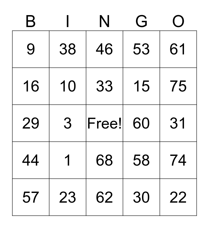 This bingo card has a free space and 24 words: 1, 23, 33, 57, 61, 9, 16, 38, 60, 68, 15, 29, 58, 74, 10, 30, 31, 46, 75, 3, 22, 44, 53 and 62.